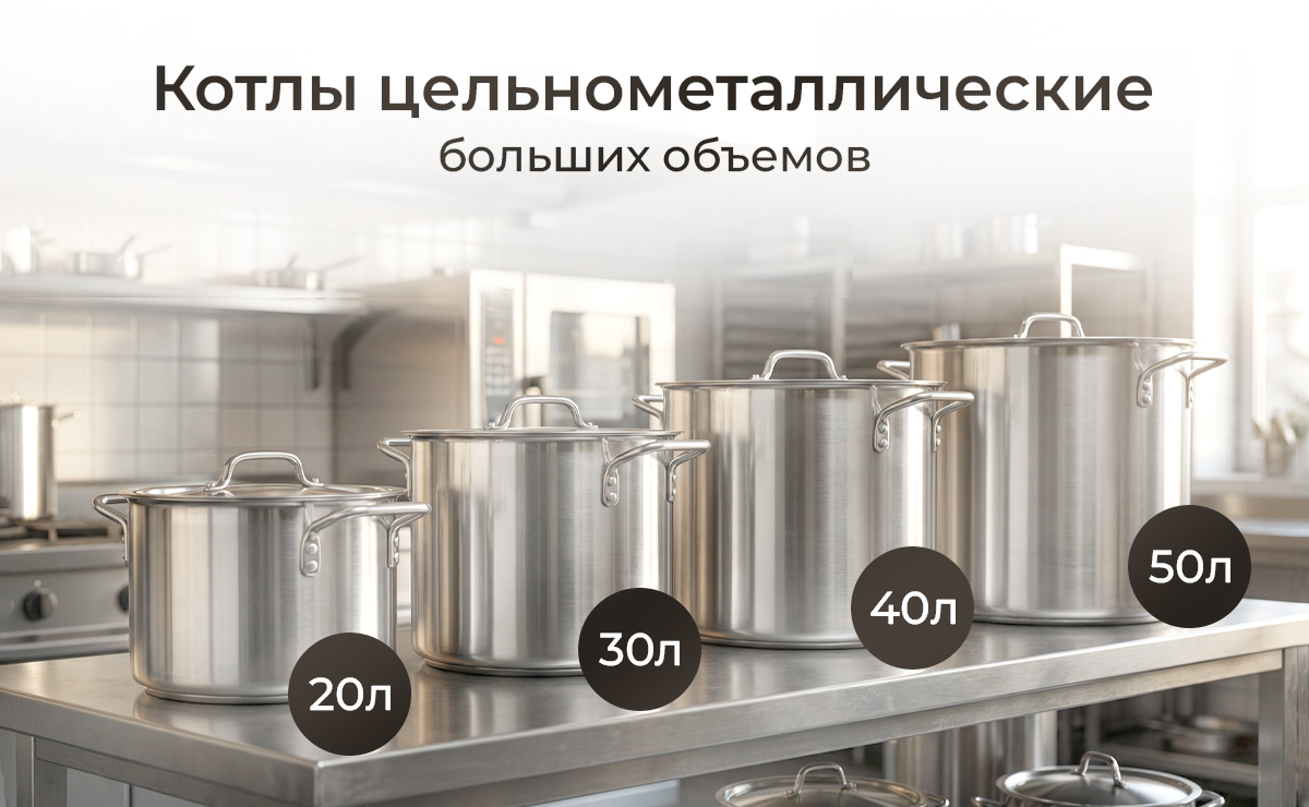 • Котлы 20–30 литров: 3–5 штук (для заготовок бульонов). На сайте АТА вы найдете их в разделе Котлы.